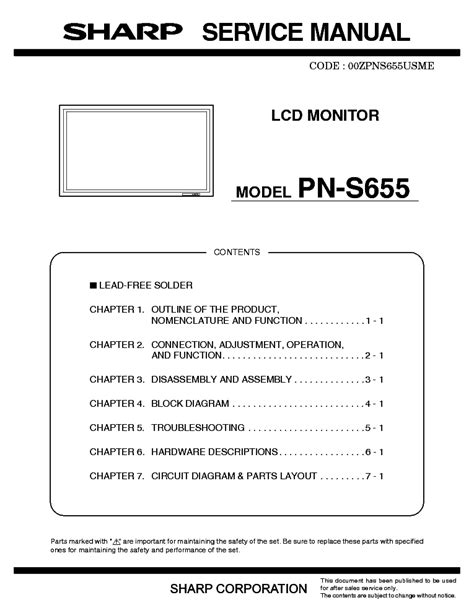 Presently you are looking for an Sharp Pn S655 Lcd Monitor Service Manual example of which we provide here within some kind of document formats like as PDF, Doc, Energy Point, as well as images of which will make it easier for you to create an Sharp Pn S655 Lcd Monitor Service Manual yourself. For a better look, you can open some examples below. All the examples about Sharp Pn S655 Lcd Monitor Service Manual with this website, we get from many sources so you could create a better record of your own.